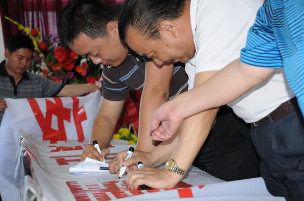 集團(tuán)公司領(lǐng)導(dǎo)及管理人員在安全宣傳標(biāo)語(yǔ)上簽名 |
