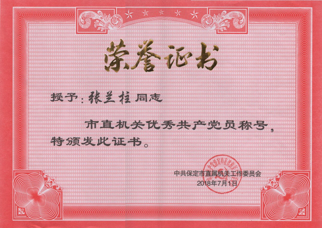 黨委書記張?zhí)m柱榮獲2017年度市直機(jī)關(guān)優(yōu)秀共產(chǎn)黨員榮譽(yù)稱號